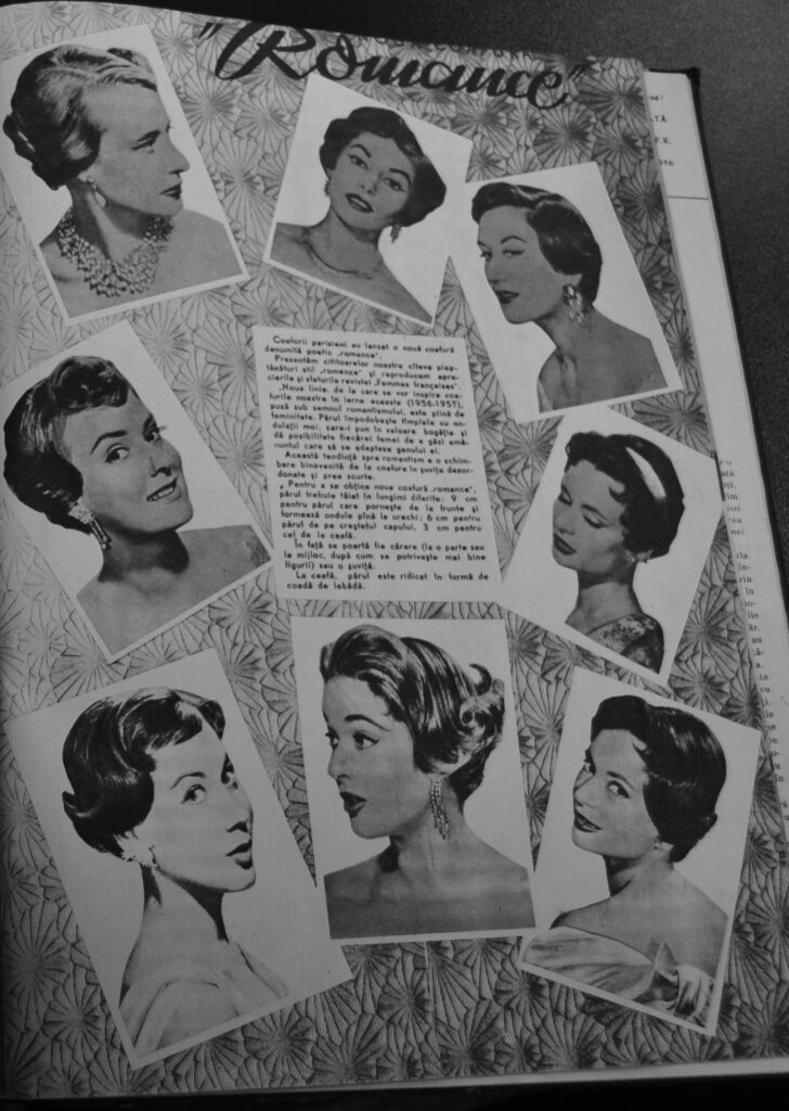 Coaforii parizieni au lansat o nouă coafură denumită poetic romance. Prezentăm cititoarelor noastre câteva pieptănături stil romance și reproducem aprecierile și sfaturile revistei Femmes francaises. Noua linie de la care se vor inspira coafurile noastre în iarna aceasta (1956-1957) pusă sub semnul romantismului, este plină de feminitate. Părul împodobește tâmplele cu ondulații moi, care-i pun în valoare bogăția și dă posibilitate fiecărei femei de a găsi amănuntul care să se adapteze genului ei. Această tendință spre romantism e o schimbare binevenită de la coafura în șuvițe dezordonate și prea scurte. Pentru a se obține noua coafură romance, părul trebuie tăiat în lungimi diferite: 9 cm pentru părul care pornește de la frunte și formează ondule până la urechi; 6 cm pentru părul de pe creștetul capului, 3 cm pentru cel de la ceafă. În față se poartă fie cărare (la o parte sau la mijloc, după cum se potrivește mai bine figurii) sau o șuviță. La ceafă, părul este ridicat în formă de coadă de lebădă.