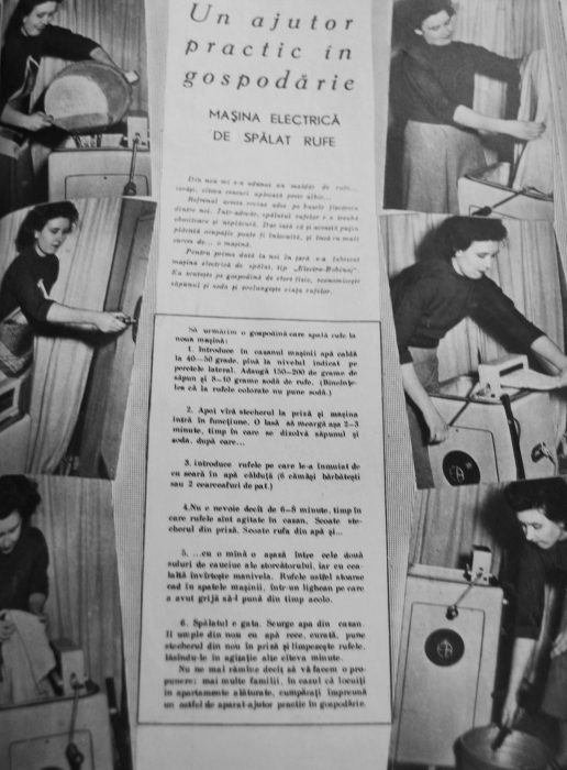 Revista Femeia din 1956 ne arată însă că nu este așa. În articolul „Un om, două norme”, e vorba despre cele două tipuri de muncă, salariată și casnică. Articolul e însoțit de fotografii cu o femeie care calcă haine și îmbracă apoi copilul. Soluțiile propuse sunt cele clasice, asemănătoare celor pe care le aduseseră feministele bolșevice în Rusia revoluționară: spălătorii publice şi „brigăzi pentru dereticat”, o mașină care să ducă copiii la școală…